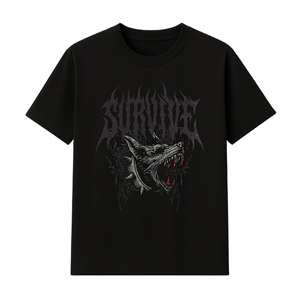 La combinación de gris y rojo sobre el negro crea un contraste muy potente y, al mismo tiempo, equilibrado. El lobo aparece rugiendo, con la boca abierta y los colmillos listos para atacar, simbolizando ese “sobrevive” que da nombre a la prenda. Los detalles en rojo refuerzan la sensación de peligro y energía, mientras que las sombras en gris aportan profundidad y volumen al dibujo. Es una camiseta ideal para quienes se identifican con un estilo urbano, oscuro y con referencias claras al mundo del metal y del tatuaje.