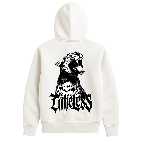 La sudadera Timeless BlackWhite blanca con capucha de CUSTOMLAB combina un fondo limpio con uno de los gráficos más potentes de la colección. En el frontal, el jaguar rugiendo se dibuja en blanco y negro con un nivel de detalle que marca la diferencia: pelaje moteado, sombras bien trabajadas y una expresión cargada de energía. Debajo, el logo Timeless en tipografía afilada se integra con el cuerpo del animal, completando una composición muy equilibrada.