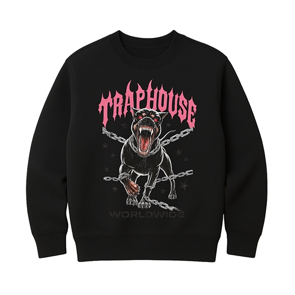 La sudadera Traphouse Pink sin capucha de CUSTOMLAB es la opción ideal si quieres el mismo impacto gráfico que la versión con capucha, pero en un corte clásico de cuello redondo. En el frontal se mantiene el perro negro encadenado avanzando hacia delante, rodeado por cadenas cruzadas y estrellas negras. Sobre su cabeza, el logo TRAPHOUSE en rosa intenso domina la parte superior del diseño, mientras que el texto WORLDWIDE en la parte inferior completa una composición que respira cultura trap por todos lados.