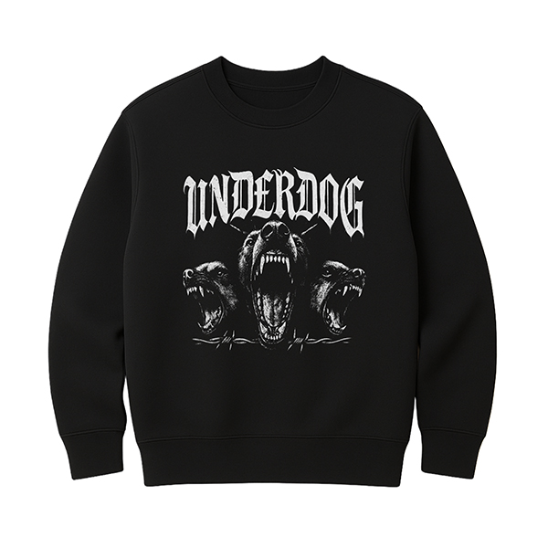 La sudadera Underdog Basic negra sin capucha de CUSTOMLAB es la prenda que no puede faltar en un armario dark y urbano. El tejido negro sirve como base perfecta para la ilustración en blanco: tres cabezas de perro rugiendo, una central más grande y dos laterales que la enmarcan, con colmillos, sombras y texturas muy marcadas. Encima, el logo UNDERDOG en tipografía afilada subraya el mensaje de la prenda: aquí está el que siempre pelea desde abajo.