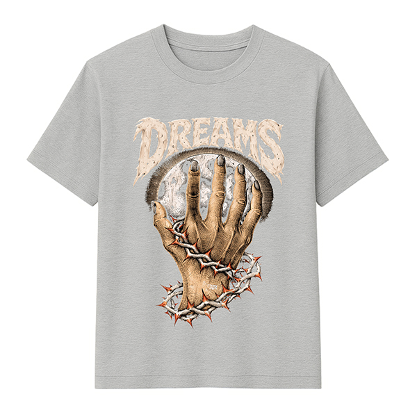 La camiseta Dreams de CUSTOMLAB es una de las piezas más artísticas de toda la colección. Sobre una base gris suave aparece una gran ilustración central: una mano en tonos piel, con uñas marcadas y textura casi realista, asciende hacia una luna llena mientras está envuelta por ramas de espinas afiladas. Encima del conjunto, el texto “DREAMS” se arquea con una tipografía desgastada que parece sacada de un cartel antiguo. El resultado es una imagen poderosa que habla de sueños que cuestan, de metas que duelen y de caminos que se recorren a pesar de las heridas.