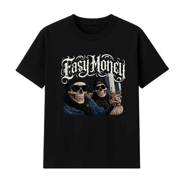 La camiseta Fasy Money de CUSTOMLAB (con logo “Easy Money” en el diseño) es pura cultura de la calle. Sobre un fondo negro se muestra una ilustración rectangular donde dos calaveras llevan pasamontañas, gafas de sol y ropa oscura. Una de ellas sostiene un fajo de billetes, la otra parece sujetar un arma o un objeto contundente, mientras al fondo se insinúan edificios de ciudad. En la parte superior, el texto Easy Money aparece en blanco con una tipografía gótica muy trabajada, llena de curvas y remates que refuerzan la estética gangster de la escena.